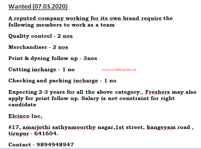 HomeTIRUPUR JOBS TODAY ( 07.03.2020 ) ALL JOBS WANTED LIST (TIRUPUR JOBS ) 👇👇 COTTONJOBS.IN Saturday, March 07, 2020