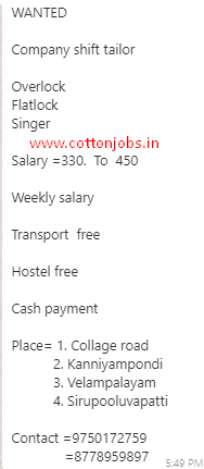 CONTACT : MANOJKUMAR K (9789432431). RECRUITMENT OFFICER, CR GARMENTS