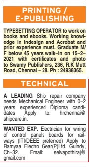 HomeCHENNAI JOBS THE HINDU (14/02/2021) HINDU -CHENNAI JOBS CLASSIFIED ADS WANTED /VACANCY LIST COTTONJOBS.IN Sunday, February 14, 2021