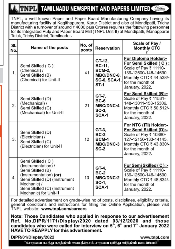 & Paper Technology. For semi-skilled (c) – should have 5 years of