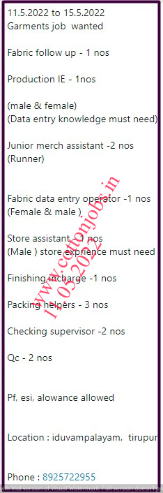 1.    Merchandiser, Experience : 2-5 years, Location: Tirupur
